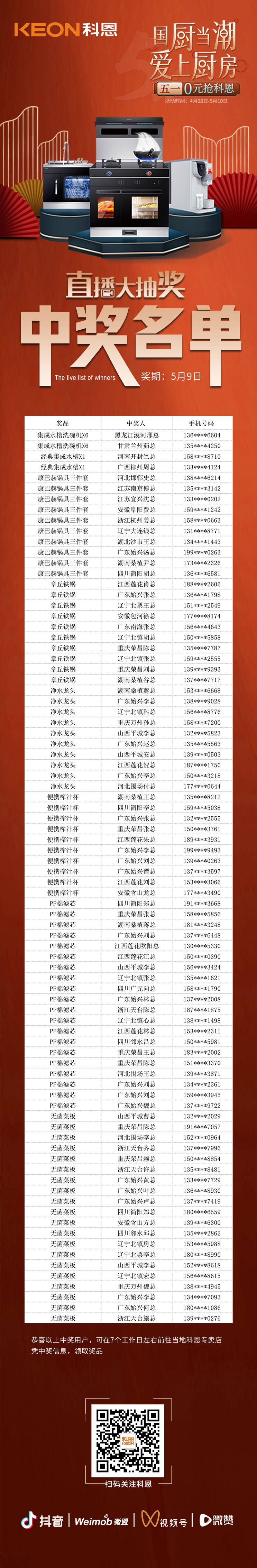 國(guó)廚當(dāng)潮,愛(ài)上廚房——0元搶科恩活動(dòng)正在火爆進(jìn)行中,為回饋消費(fèi)者,科恩電器特于5月9日晚舉行了第二輪直播大抽獎(jiǎng)活動(dòng)。在5日公布了第一輪直播大抽獎(jiǎng)中獎(jiǎng)名單后,小編收到了很多用戶的后臺(tái)留言,紛紛詢問(wèn)第二輪大抽獎(jiǎng)的時(shí)間以及參與方式,本次活動(dòng)吸引了眾多消費(fèi)者前來(lái)參與,活動(dòng)精彩紛呈,直播間也熱鬧非凡,全國(guó)各地的朋友們積極參與,用指尖傳遞著國(guó)廚當(dāng)潮,愛(ài)上廚房的精致廚房新理念。