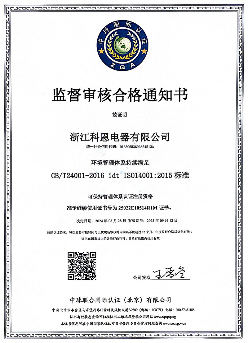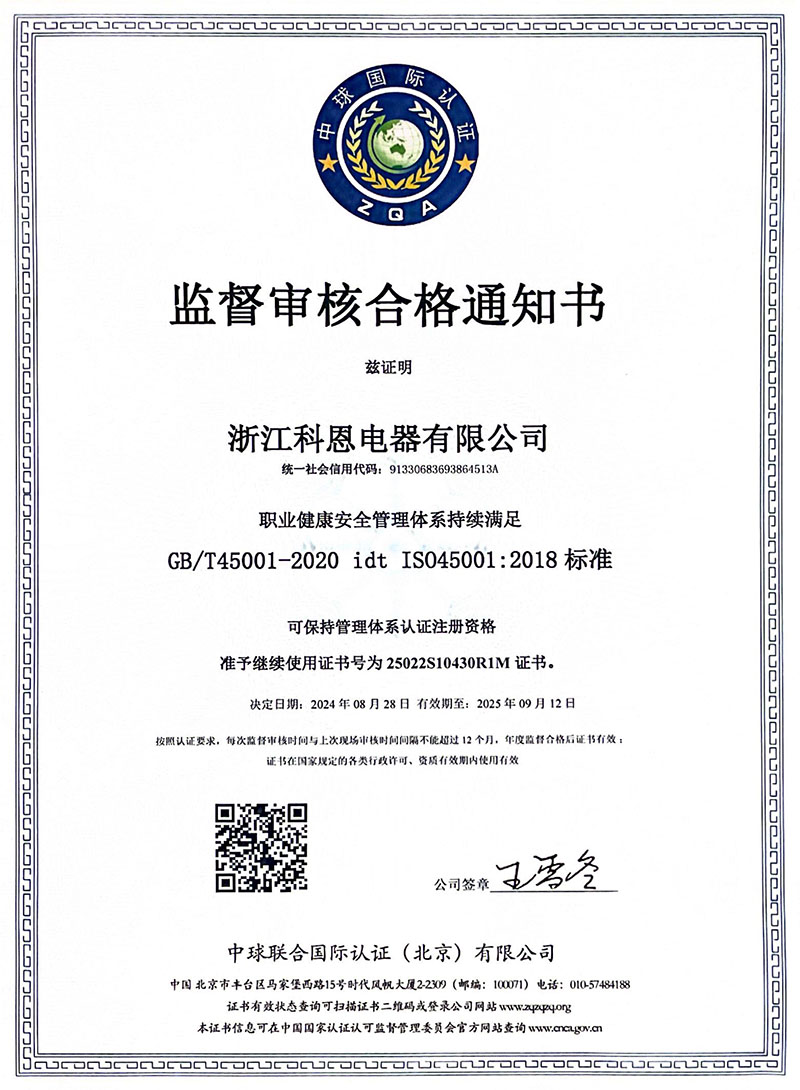 近日,浙江科恩電器有限公司經過嚴格審核,成功獲得了質量管理體系GB/T19001-2016ISO9001:2015)、環境管理體系GB/T45001-2020ISO45001:2018)以及職業健康安全管理體系GB/T24001-2016ISO14001:2015)的三項國際標準認證。