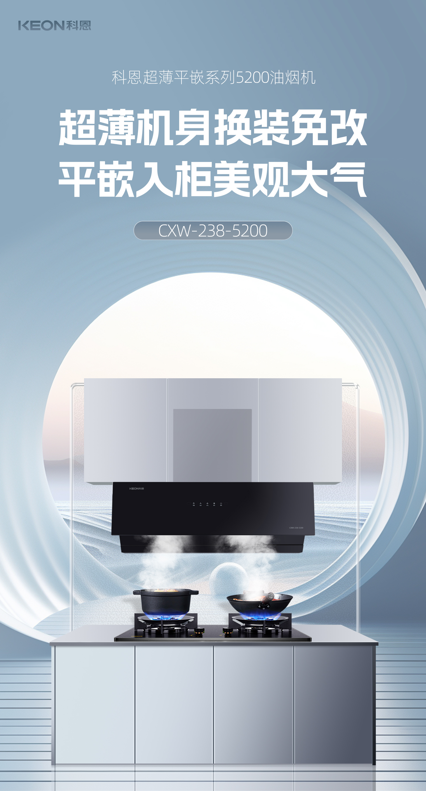 科恩此次推出的5200系列超薄煙機(jī)為老廚房換新帶來(lái)了全新福音,超薄機(jī)身可免改式安裝方式,可直接替換原有煙機(jī),無(wú)需改造櫥柜空間即可實(shí)現(xiàn)美觀協(xié)調(diào)的效果。