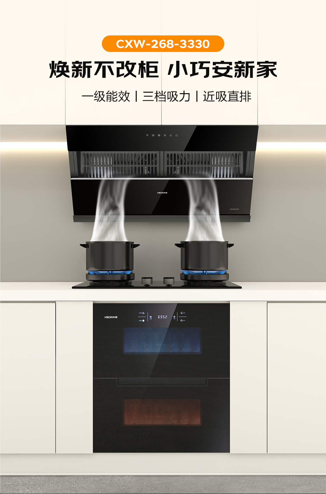 低空凈煙,寸土必爭。科恩新品3330油煙機,采用風機下置無圍板設計。新舊廚房安裝更隨心,330mm低空吸煙,吸盡油煙,控煙于源頭。895mm寬屏如巨網收束油煙雙灶同炒的戰場,也能從容控場谷雨煥新,小空間大革新。35cm緊湊機身減少衛生死角,開闊廚房空間。大容量油杯無需頻繁傾倒,冷光燈點亮料理的儀式感揮手智控,指尖不沾油膩自清潔程序悄然運轉還廚房一清爽