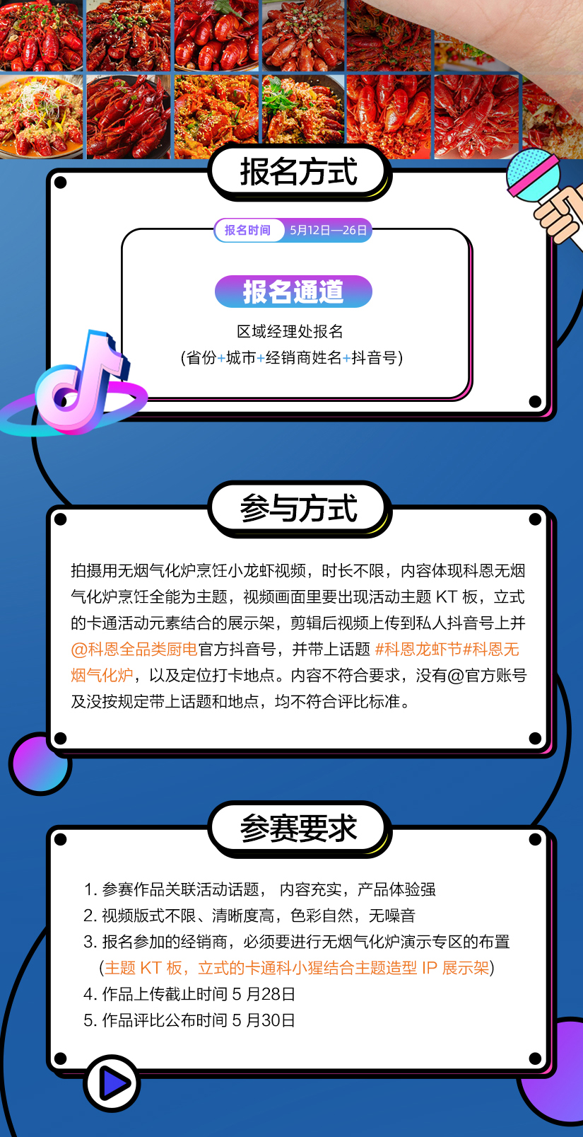 五月的煙火氣,藏在小龍蝦肥美的蝦鉗里,藏在氣化爐的勁焰猛火中,爐力全開(kāi),鉗動(dòng)江湖。5 月12日——5月26日,一場(chǎng)舌尖與視覺(jué)的雙重盛宴拉開(kāi)序幕!科恩龍蝦節(jié)抖音短視頻PK大賽重磅來(lái)襲,誠(chéng)邀全國(guó)科恩專(zhuān)賣(mài)店,共赴這場(chǎng)創(chuàng)意與實(shí)力的較量,用鏡頭記錄無(wú)煙料理的無(wú)限可能。