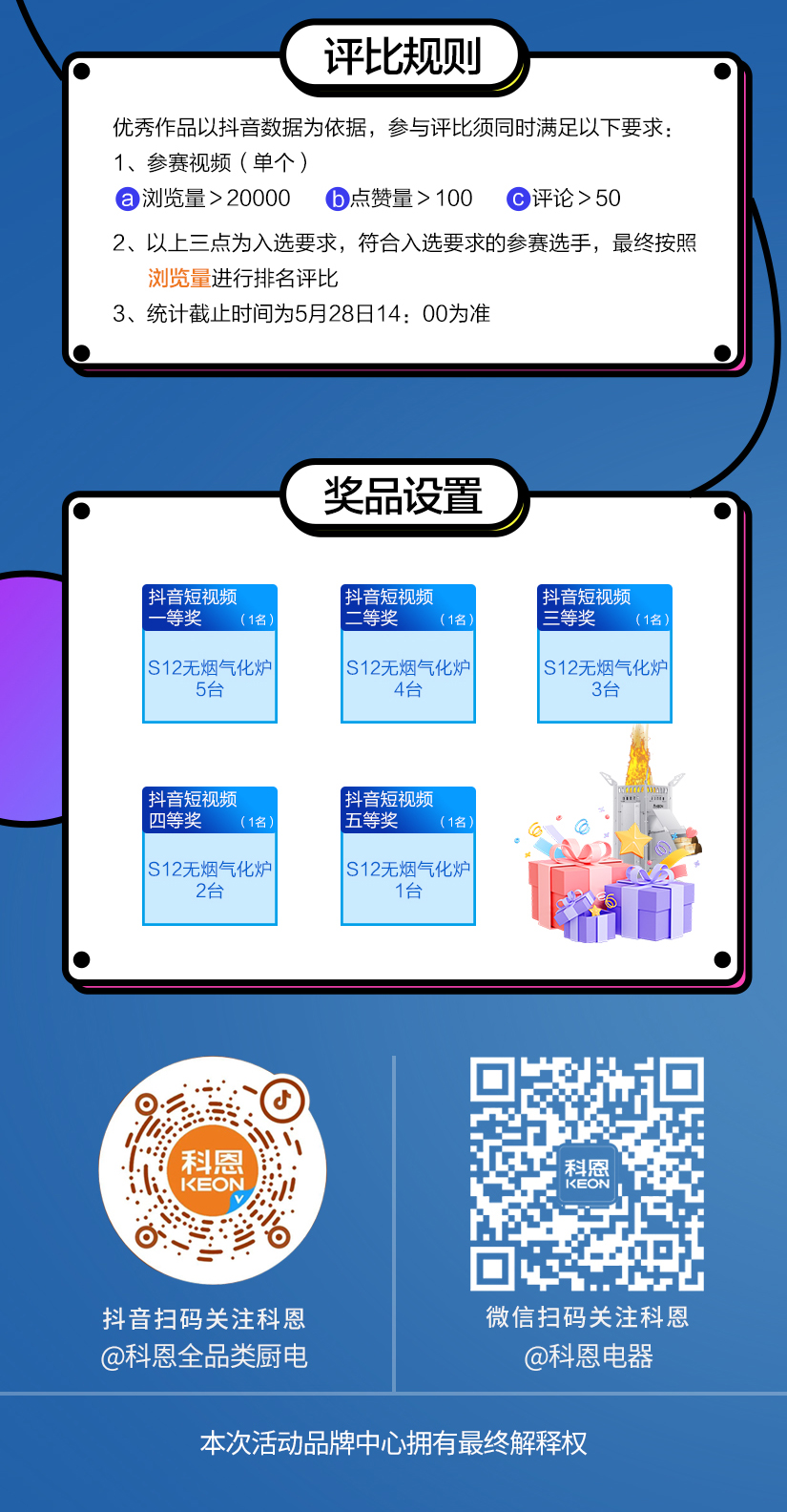 江湖風(fēng)云起,爐火論英雄。快收藏這份規(guī)則秘籍。福利升級(jí),獎(jiǎng)品豐厚,煥新好禮帶回家。廚房江湖,等你來(lái)戰(zhàn)。@科恩全品類(lèi)廚電官方抖音號(hào),帶上話題 #科恩龍蝦節(jié)#科恩無(wú)煙氣化爐,定位打卡地點(diǎn),即刻點(diǎn)燃爐火,舉起鏡頭,用一場(chǎng)色香味俱全的短視頻盛宴。搶占今夏流量C位!