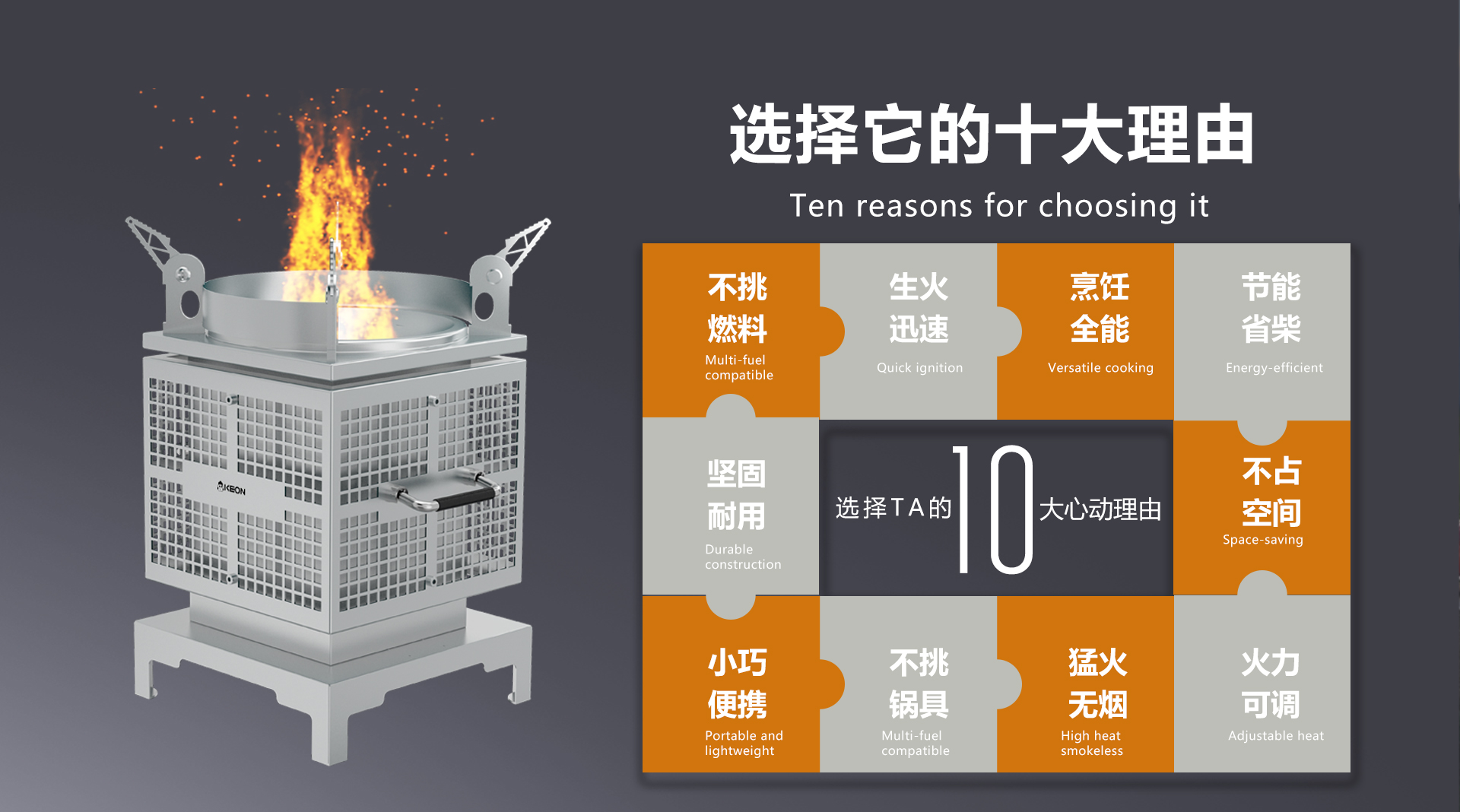 一爐多用,美食無界。不銹鋼鏤空支撐腳,內收折疊,穩固承重。從山野到河灘,科恩火箭爐S12,一機打造移動米其林廚房,戶外黨終極神器。無煙猛火,征服荒野。收縮添柴口支持雙模切換燃燒,從速燃到持久續航 ,荒野也能玩轉火候,科恩火箭爐S12,重新定義野炊法則。