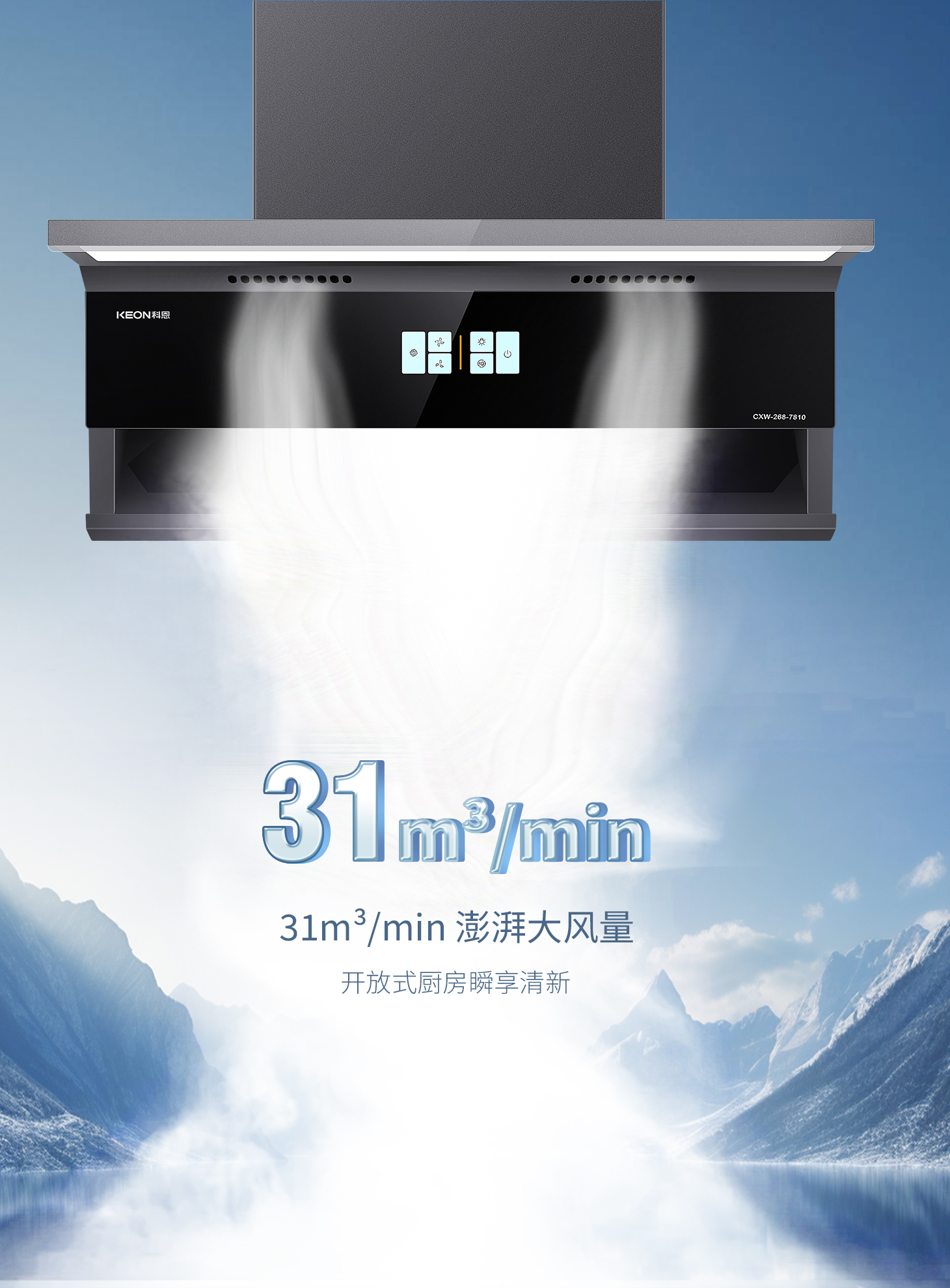 凈煙神速 顏值擔當。新年爆炒,油煙無蹤,3秒清場,全域攏煙,1350Pa變頻風壓,排煙順暢。2.5cm輕薄機身,冰川灰鑲邊,天鵝頸設計,釋放開闊空間,揮手智控,凈煙不沾油污。易潔省心 健康相伴。特氟龍工藝,油污不粘。智旋清洗,吸力持久強勁。3分鐘延時關機,余煙盡除,IP67全景天幕,護眼清晰,模塊化觸控,操作直觀簡單,0.5立方大空間,翻炒不碰頭。