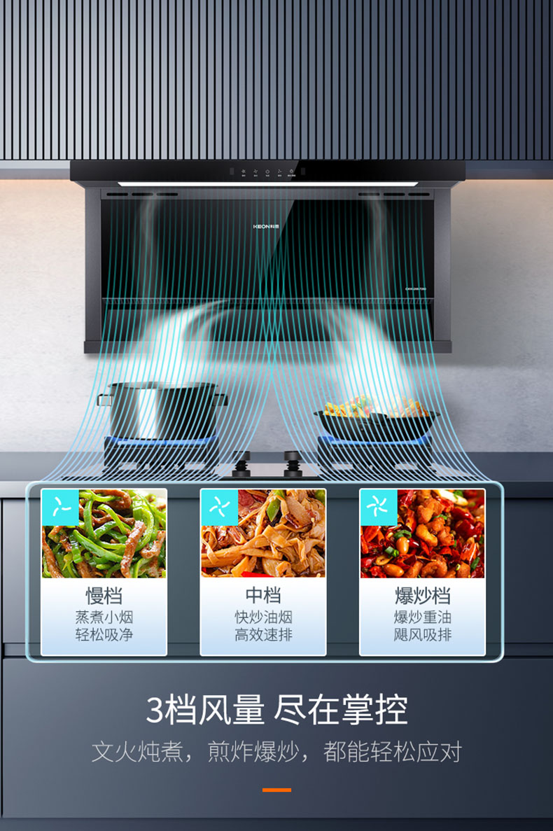 3檔風量,盡在掌控。無論文火燉煮,煎炒小炒還是中式爆炒,都能輕松應對。